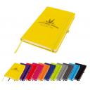 A5 Casebound Notebook with an elastic closure, pen loop and coloured ribbon, made to order in the UK finished in soft touch Belluno PU with a real leather look and feel Belluno is available in a choice of 22 colours each with a unique colour change when embossed, making your branding distinctive and accurate even on fine detail