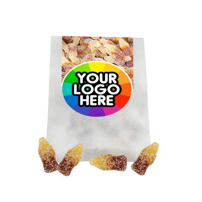 An Approximate 40g tub of Fizzy Cola Bottles, branded with a logo label.