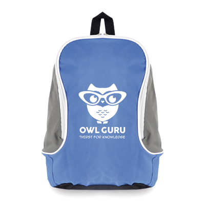 600D polyester rucksack with coloured front and shoulder straps, grey backing, white trim and black base. Features include twin zip closure, padded shoulder straps and black hanger loop.