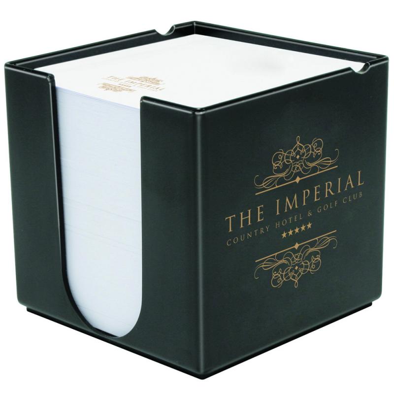 Mini Holder containing approximately 500 sheets of plain white paper from a sustainable source. Incorporates pen rest. Prices shown are for printing 1 colour on the sides of the holder only, same design. Plain sheets. Manufactured in the UK in our Carbon Zero factory.